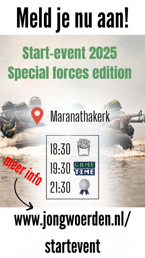Op vrijdag 12 september ben je vanaf 18:30 welkom in de Maranathakerk. We zullen de avond beginnen door gezellig samen patat te eten om daarna een potje ”Special Forces” te spelen in het Wijkpark Molenvliet. Om 21:30 sluiten we de avond af met de prijsuitreiking en een hapje & drankje.