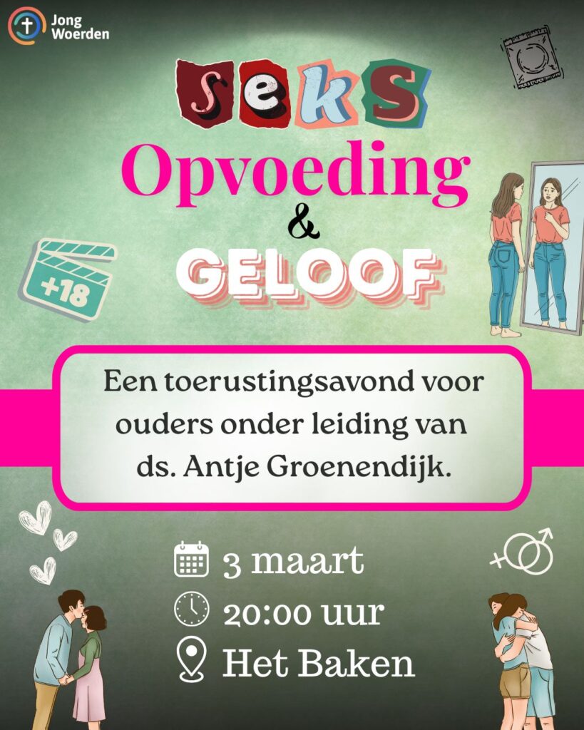 Voor alle ouders met thuiswonende kinderen organiseert Jong Woerden op dinsdagavond 3 maart een avond over seks, opvoeding en geloof in Het Baken. Antje Groenendijk heeft veel ervaring in het geven van workshops over seksualiteit aan middelbare scholieren. Ook als je nog geen kinderen of nog jonge kinderen hebt, is dit thema erg belangrijk. Onderwijs jij je kinderen? Of laat je het over aan docenten en internet? Laat ons even weten of je komt door dit formulier in te vullen!