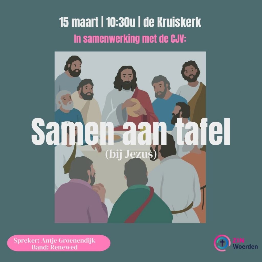 De volgende ZIN-dienst is in samenwerking met de CJV vormgegeven en vindt plaats op 15 maart. Het thema van deze dienst is ‘Samen aan tafel (bij Jezus)’ en de hoofdvraag die centraal staat is ‘Wat betekent het om samen met Jezus aan tafel te gaan?’ In deze dienst zal Antje Groenendijk voorgaan en met ons ontdekken wat het avondmaal voor ons betekent. Tijdens de dienst zullen we ook gezamenlijk het avondmaal vieren. De muziek tijdens de dienst wordt verzorgd door Renewed en ligt de presentatie weer in handen van Lysanne en Henriëtte.